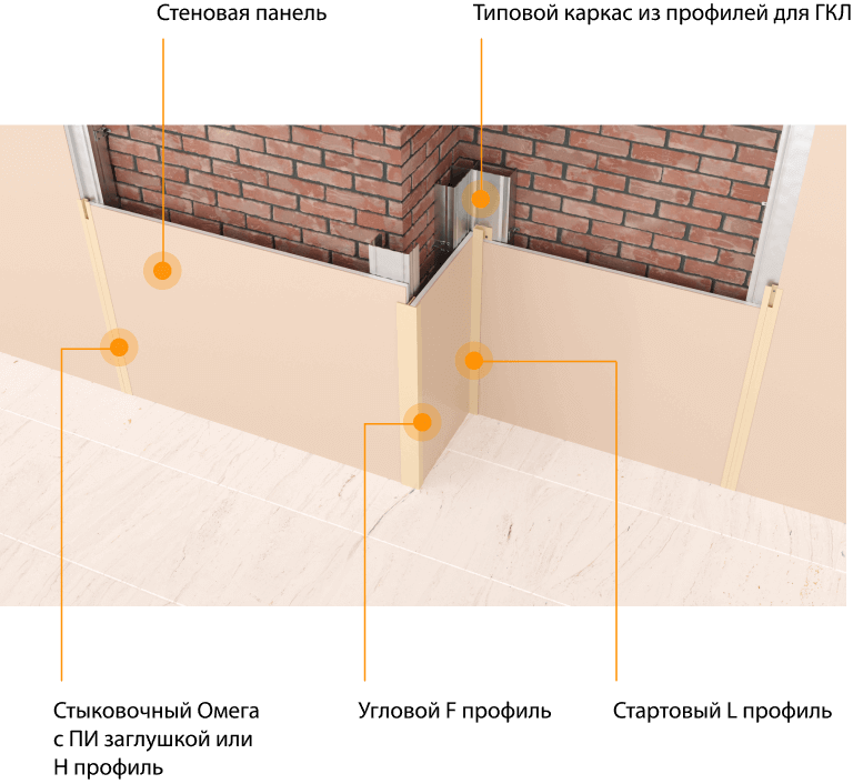 Система декоративных монтажных профилей, предназначенных для крепления декоративных стеновых панелей (на любых основах: ГКЛ, СМЛ, ГВЛ, ГСП, ГМЛ). Включает в себя стартовый и стыковочные профили (L, H, Омега, ПИ, Т). Окрашивается в любой цвет по каталогу RAL.